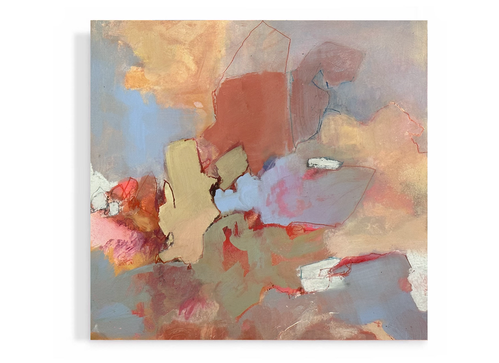 (Mixed media: Acrylic paint, pastel, crayon, graphite, spray paint, silver foil, vellum, on gallery wrapped canvas)