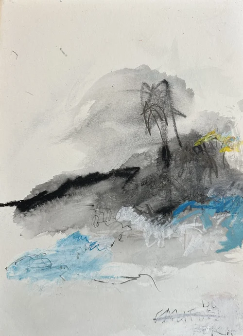Watercolor pastel. Graphite. China marker. Oil pastel. Ocean water. Beach sand. On acrylic paper.