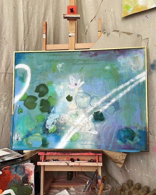 (Acrylic paint, pastel, crayon, graphite, spray paint, silver foil, vellum on canvas in a reclaimed frame)